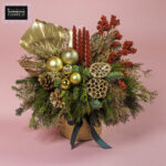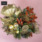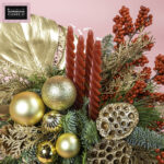 A modern twist on a traditional advent look with gilded Monstera, Pine and Nobilis with painted Conifers, Berries and ornaments, crowned with glowing red candles .