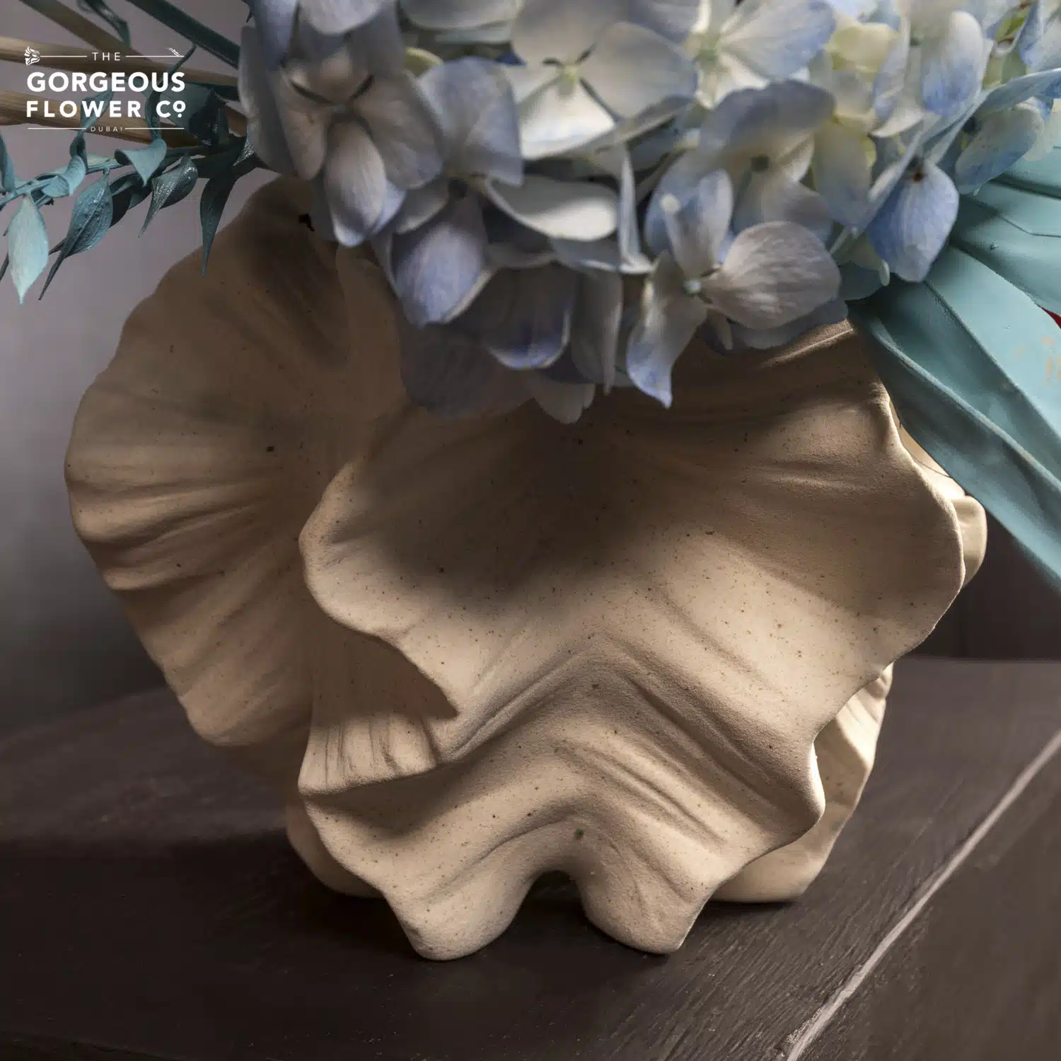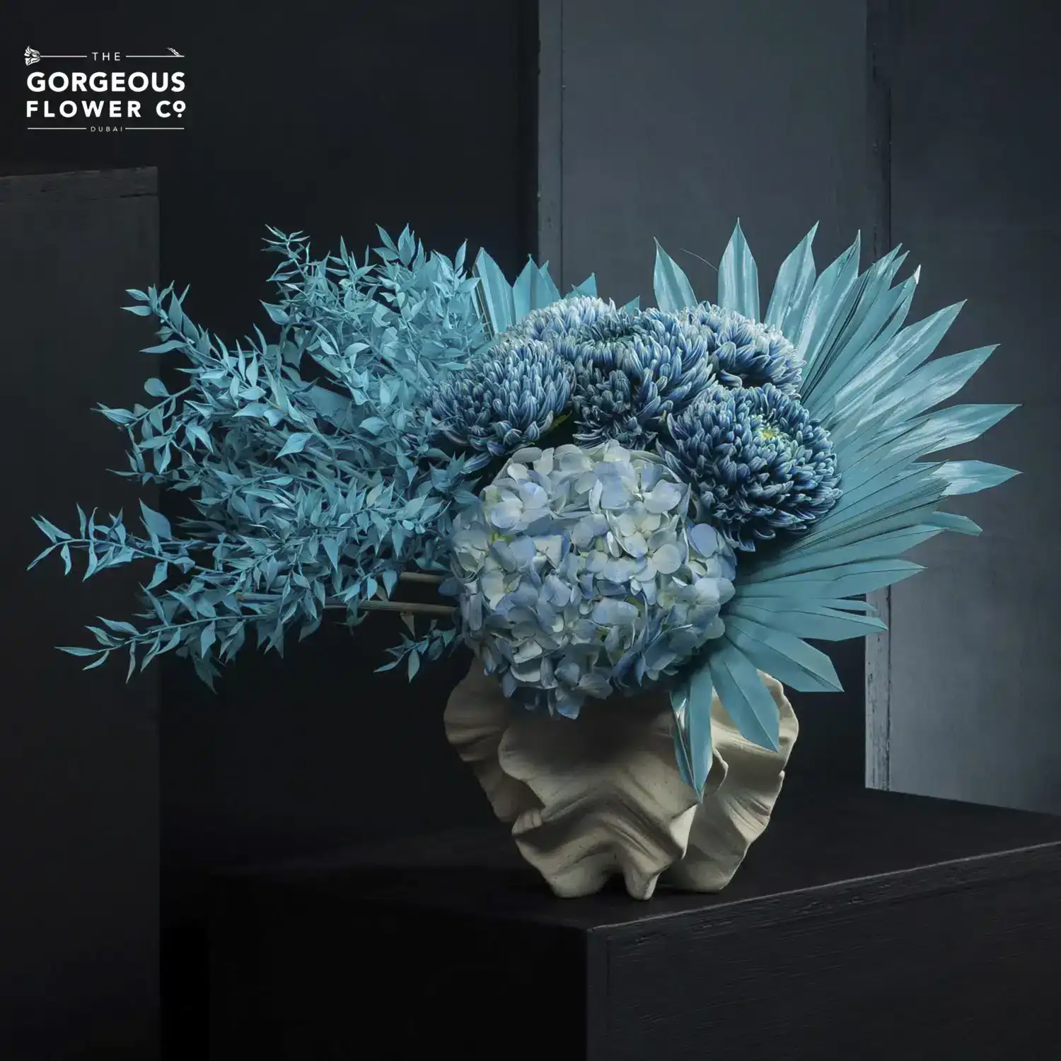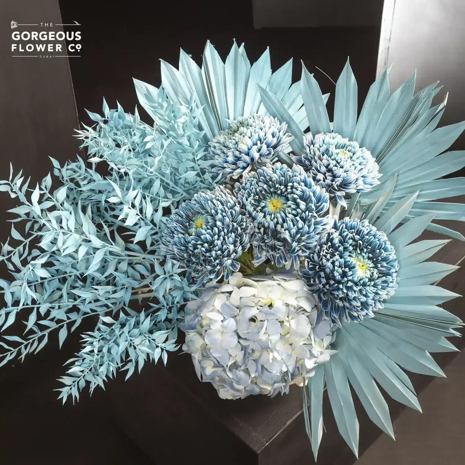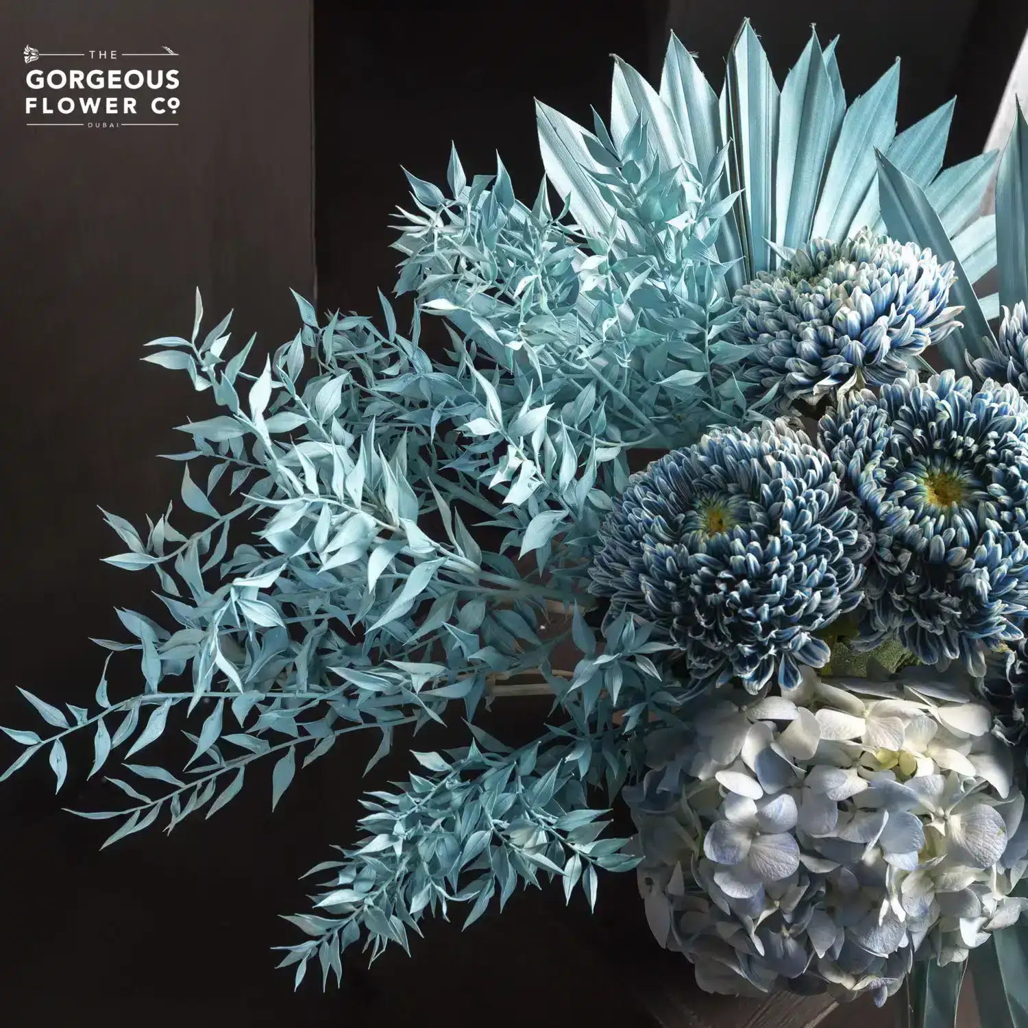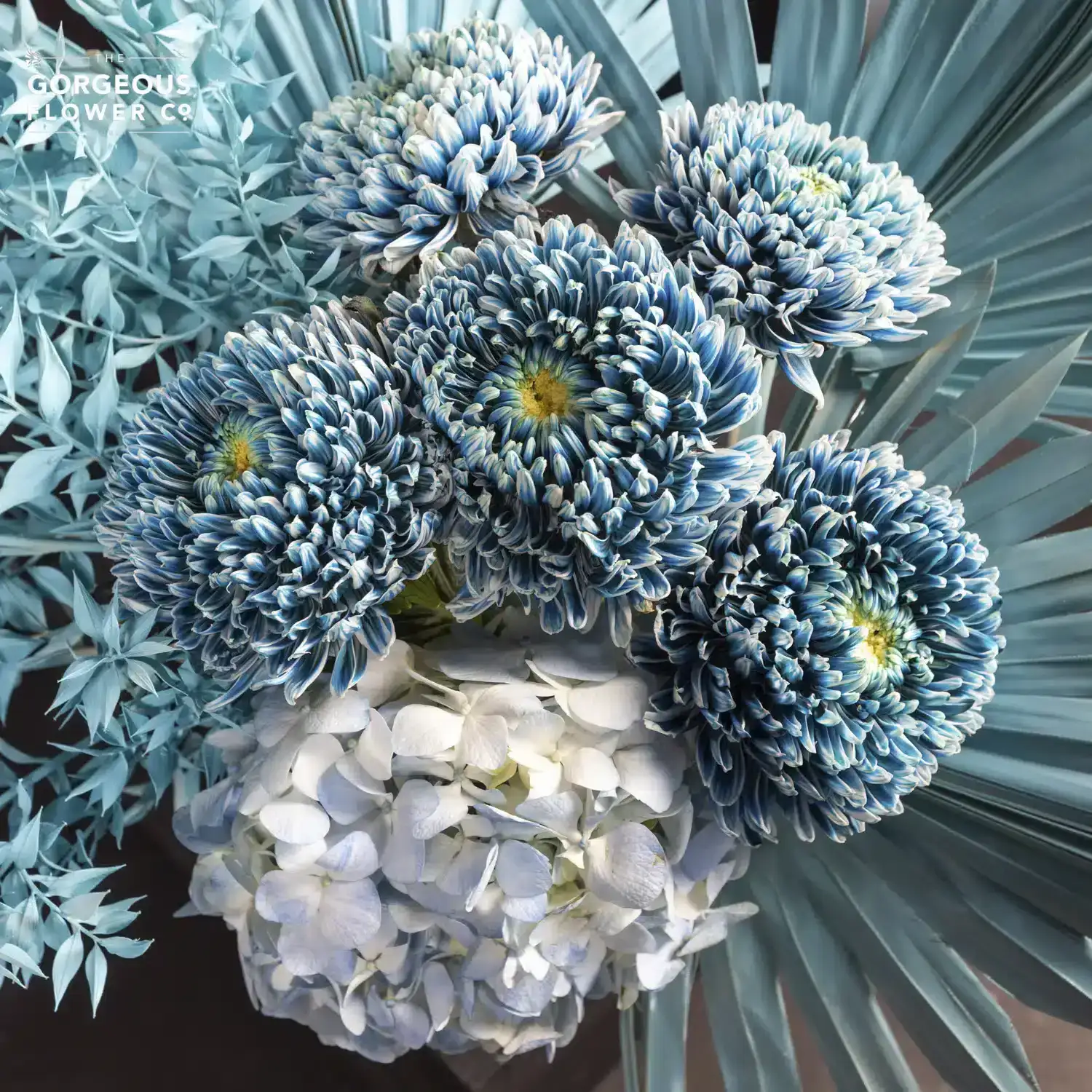 A ceramic vase arrangement with blue Hydrangea, teal-painted Chrysanthemums, Italian Ruscus, and teal Palm Spears.
