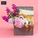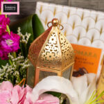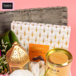 An elegant basket arrangement featuring florals with a glistening ramadan moon, a ramadan lantern, dates, and gourmet date cookies ,thoughtfully designed for meaningful gifting and festive sharing.
