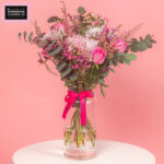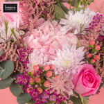 Every petal in this bouquet carries a message of hope. In delicate pinks, with Roses, Hydrangea, Astilbe, Wax flower, Chrysanthemums, Hypericum, and Eucalyptus, it’s our way of standing together during Breast Cancer Awareness Month.
