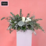 A modern festive centrepiece consisting of Pine Leaves, Noblis, Conifer, Eucalyptus, Lotus painted Silver, Betula, Skimmia Silver and Cotton.