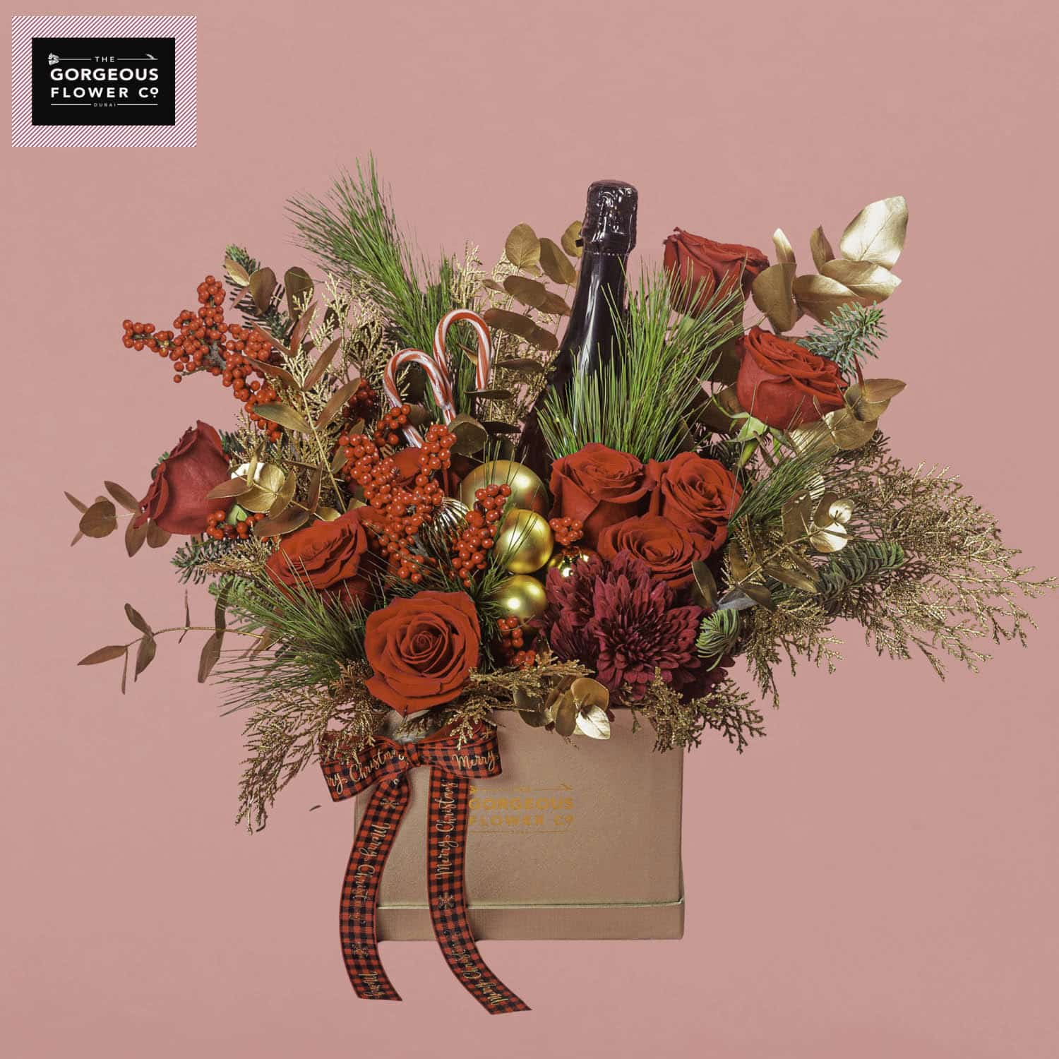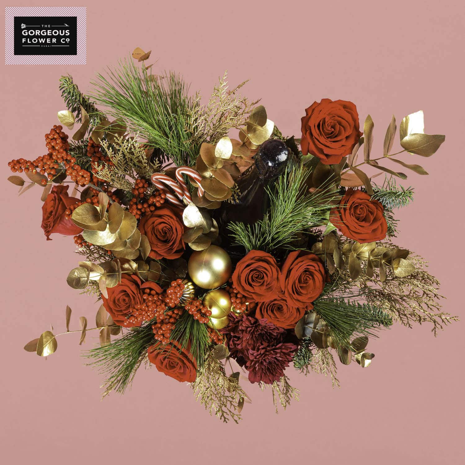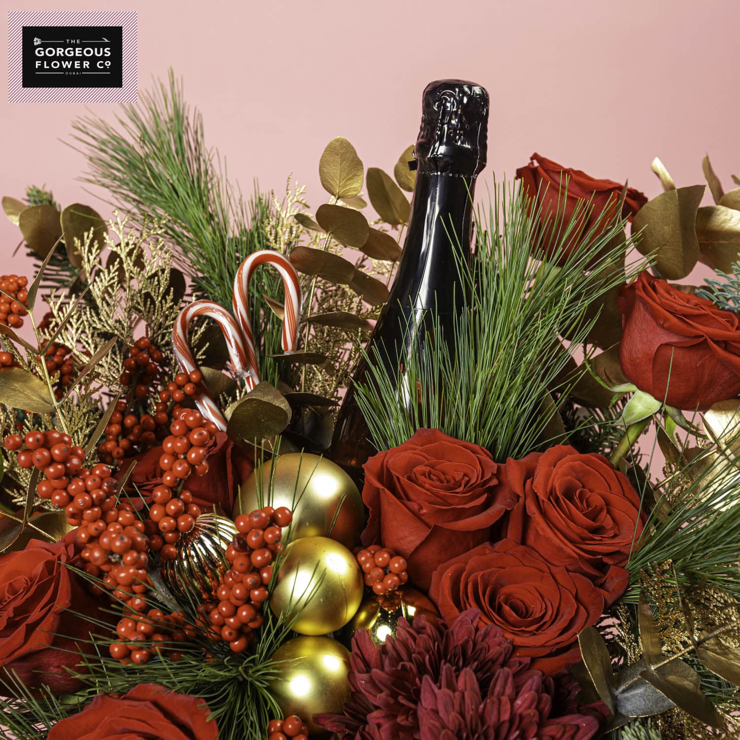 The Christmas Eve Arrangement is a festive masterpiece, featuring a blend of red and green blooms like elegant roses and Ilex berries, all nestled in a luxurious gold pot. This beautiful mix captures the essence of the holiday season, perfect for adding a touch of warmth and cheer to your Christmas celebrations.