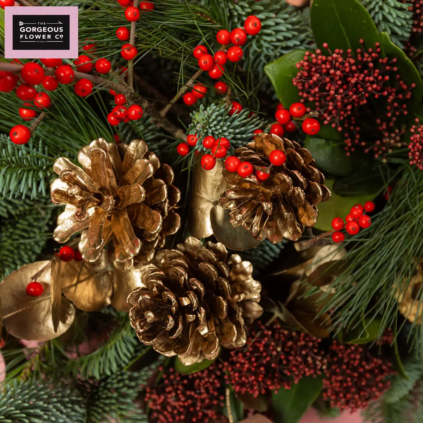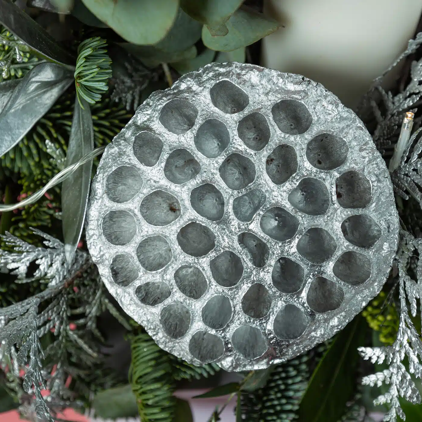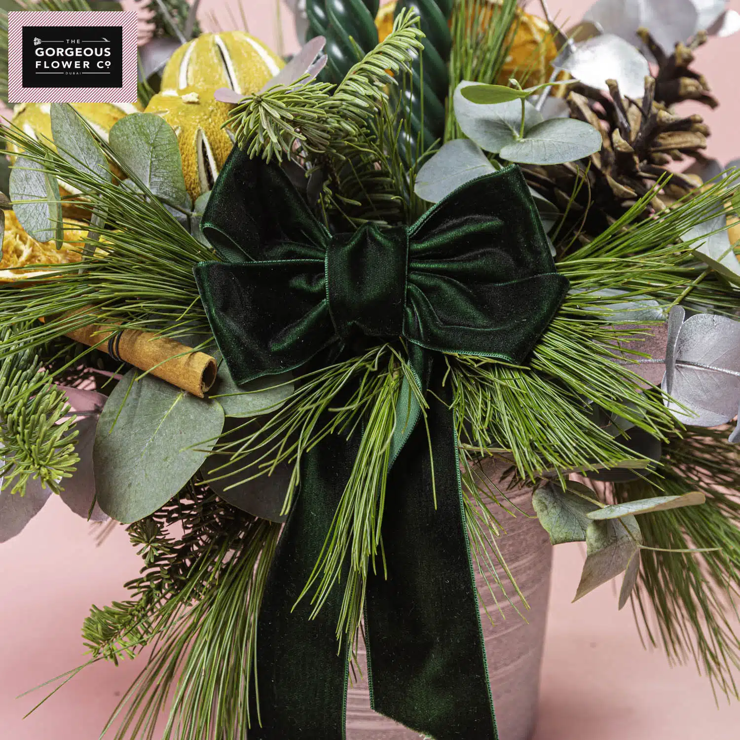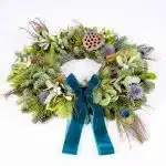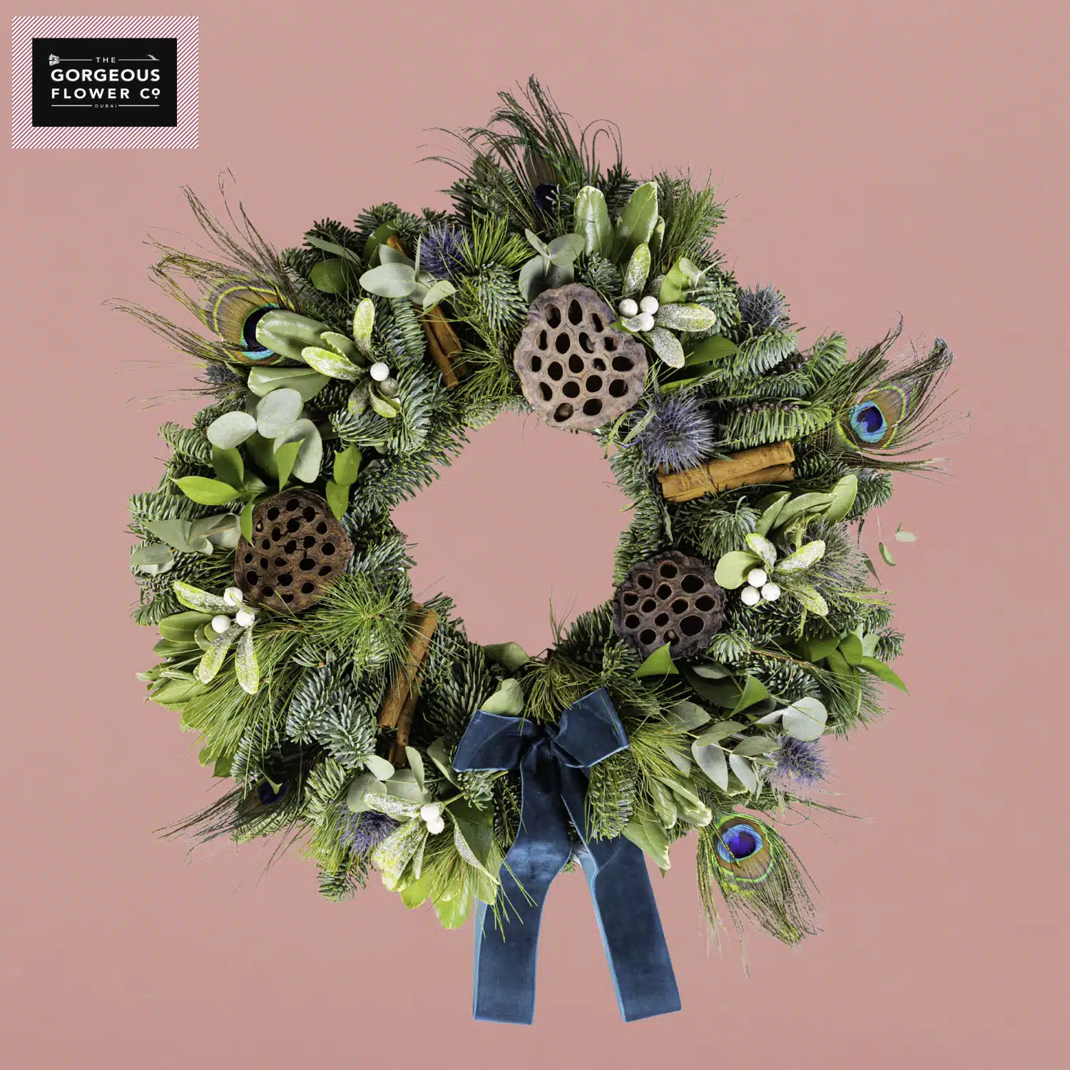 A luxurious festive wreath consisting of Noblis, Conifer, Eryngium and decorated with Peacock Feathers, Lotus Heads, Cinammon Sticks and finished with a beautiful Green Velvet bow!