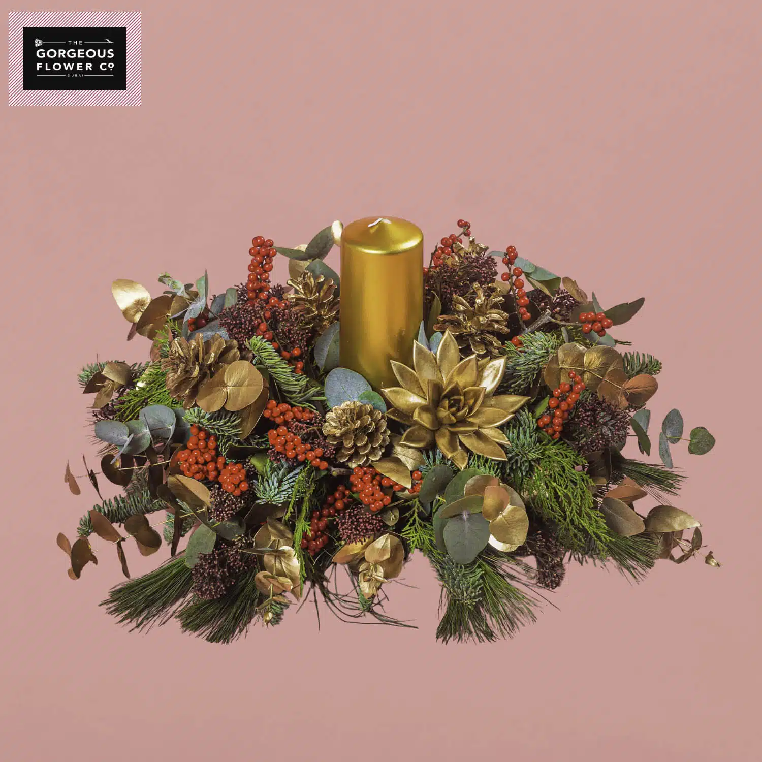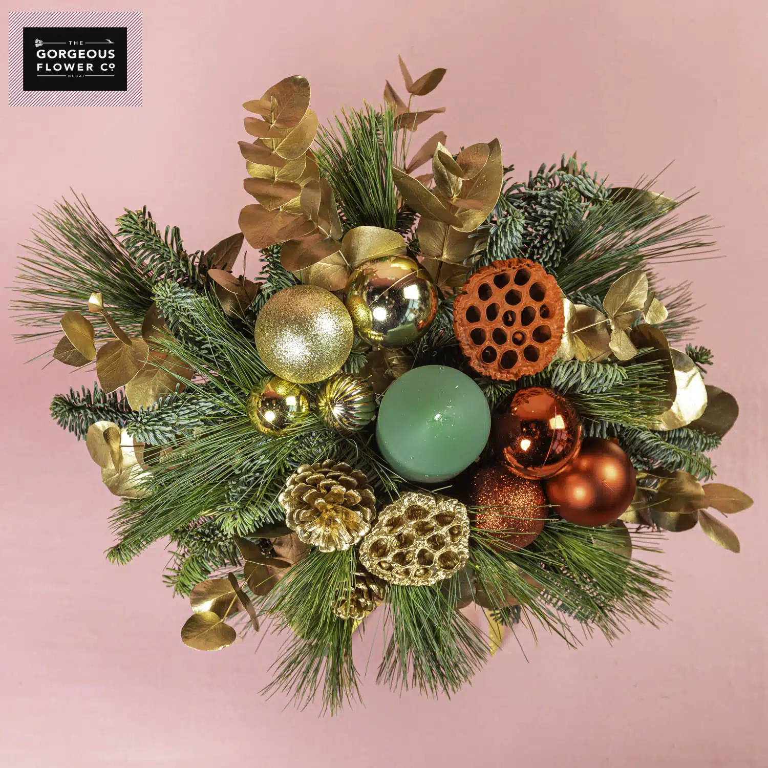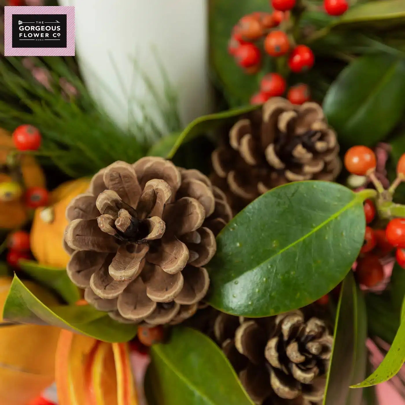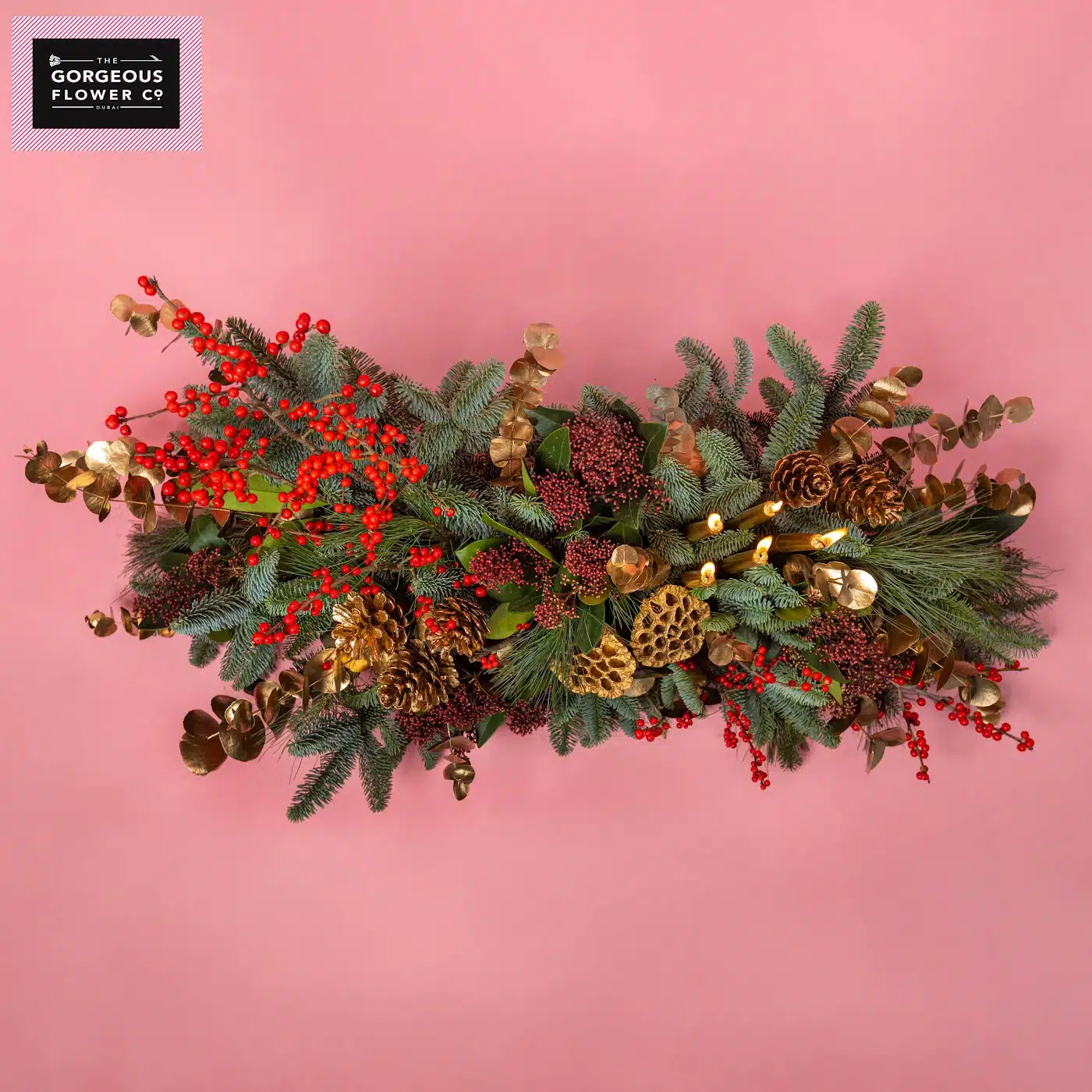 A luxurious festive wreath consisting of Noblis, Conifer, Eryngium and decorated with Peacock Feathers, Lotus Heads, Cinammon Sticks and finished with a beautiful Green Velvet bow!