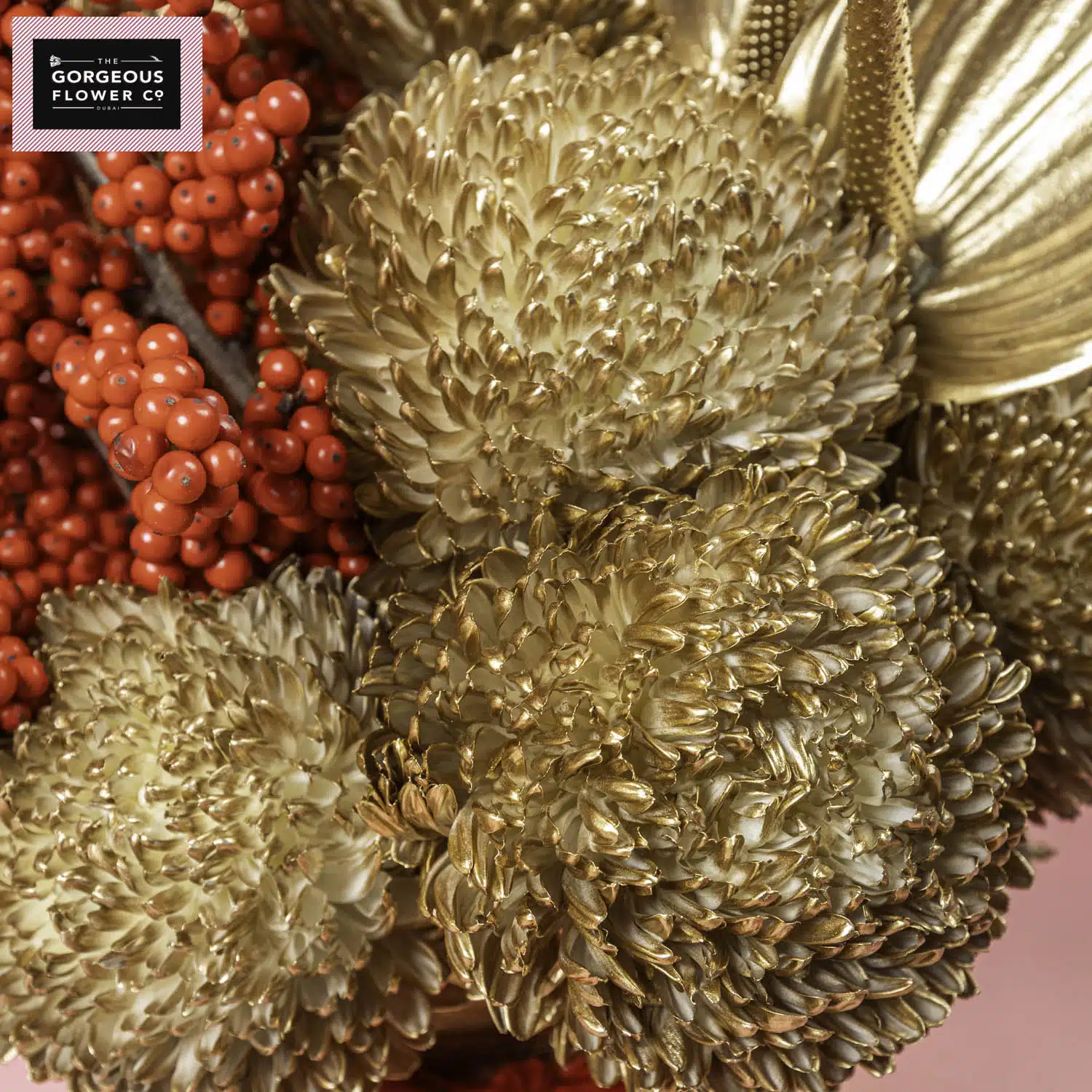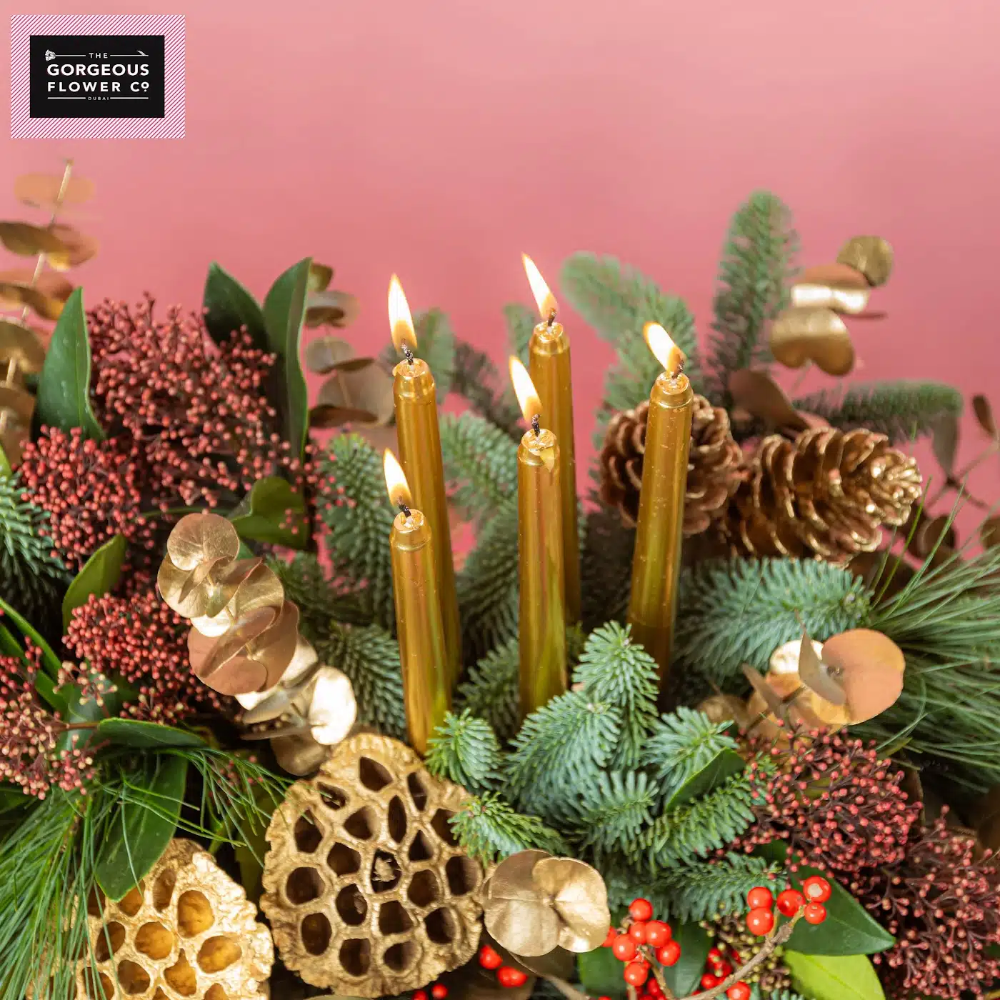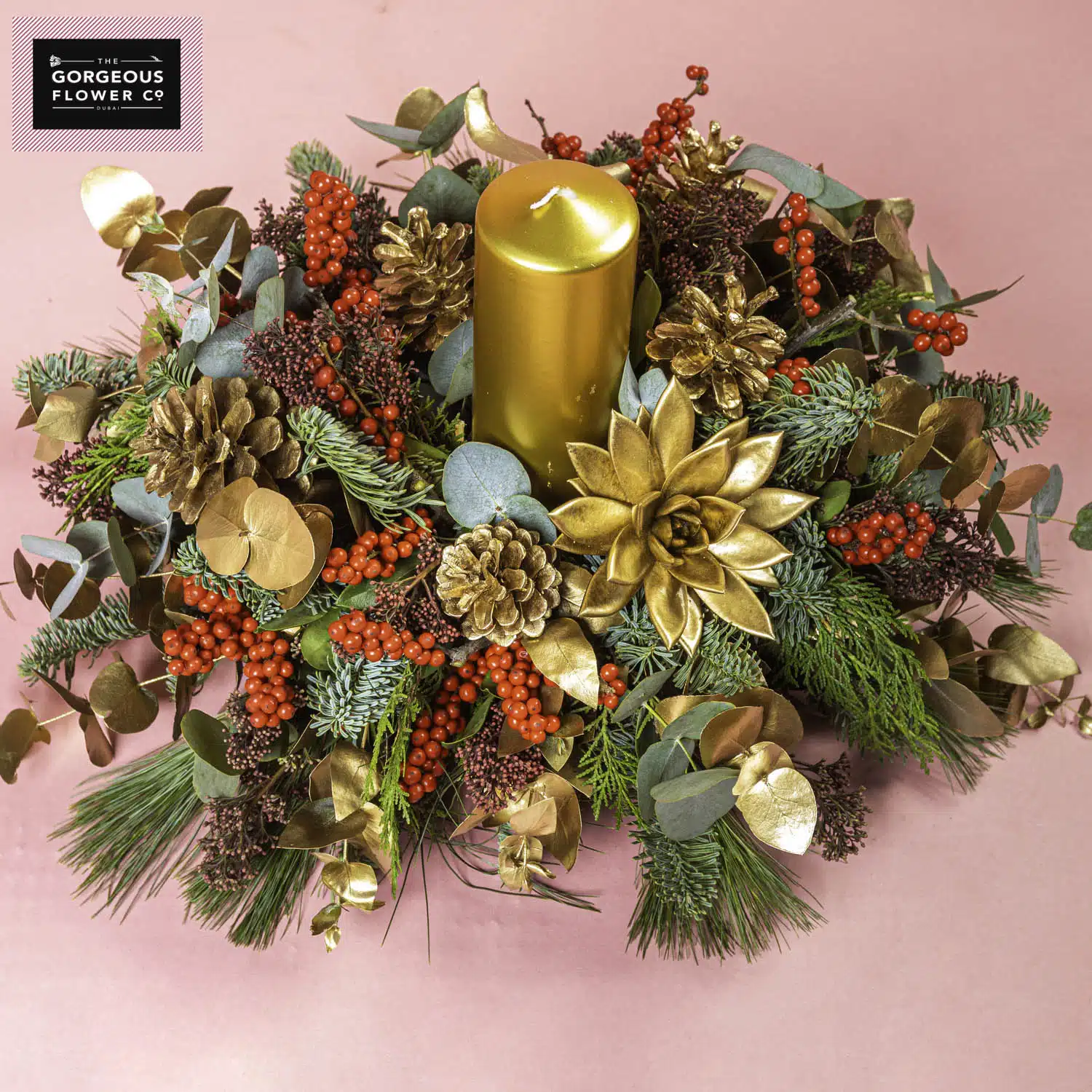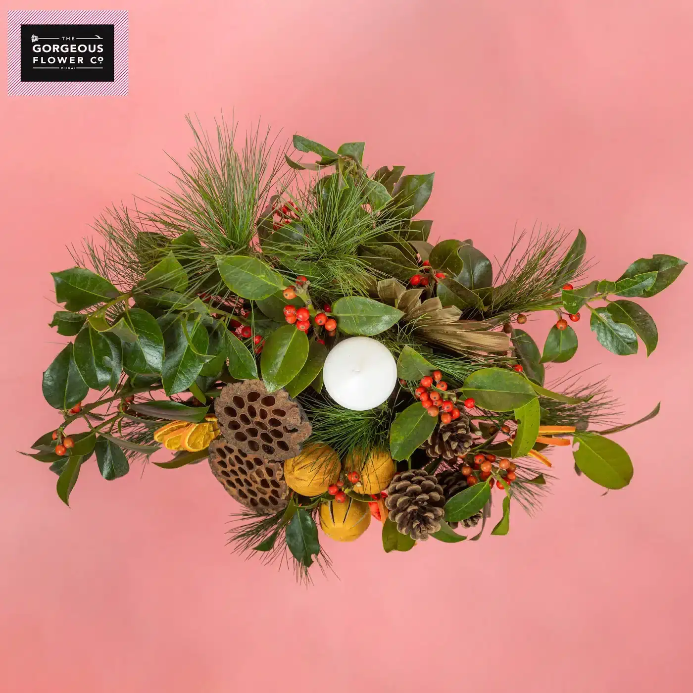 A luxurious festive wreath consisting of Noblis, Conifer, Eryngium and decorated with Peacock Feathers, Lotus Heads, Cinammon Sticks and finished with a beautiful Green Velvet bow!