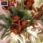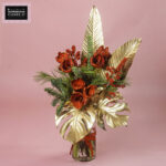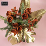 A bold and luxurious Christmas arrangement featuring vibrant Amaryllis, Iylex Berries, lush Nobilis, and shimmering Gold-Painted Leaves and Monstera painted. Rich, festive, and perfect for adding glamour to any holiday setting.
