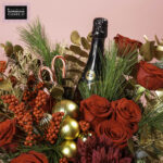 A glamorous arrangement overflowing with rich red Roses, vibrant Ilex berries, crimson Conifer, Pine leaves, Nobilis, and Eucalyptus, artfully designed in an opulent box to embody the warmth and magic of the season.