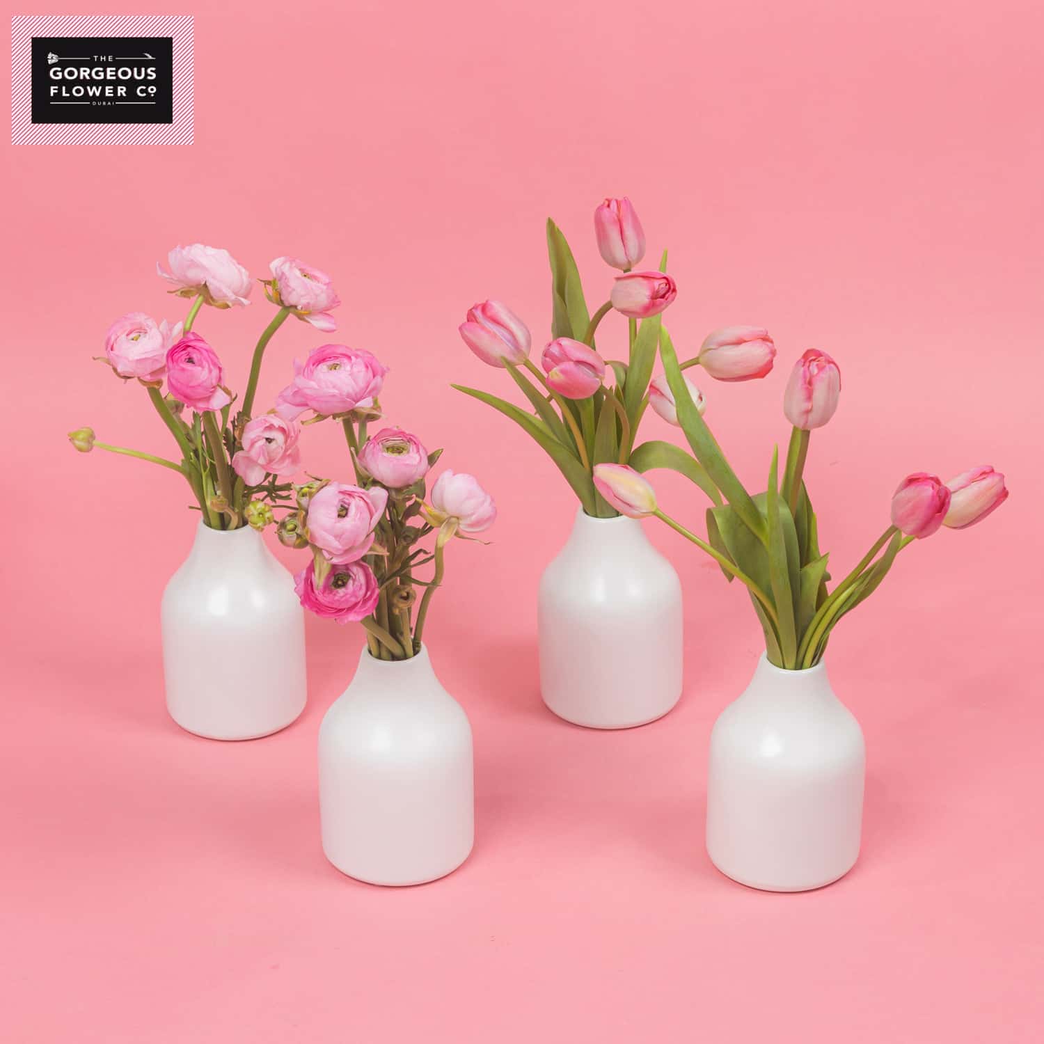 A thoughtful bundle of 4 vases with pink Rananculus and Tulips.