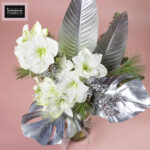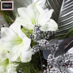 A bold and luxurious Christmas arrangement featuring vibrant Amaryllis, Iylex berries painted silver, lush Nobilis, and shimmering silver painted Leaves and Monstera painted. Rich, festive, and perfect for adding glamour to any holiday setting.