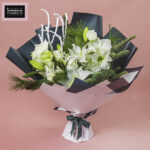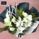 A serene winter bouquet featuring graceful Roses,Lilies, Amarylis, lush Pine leaves , Nobilis and textured Betula snow. Soft, snowy and beautifully festive — a timeless expression of Christmas elegance.