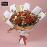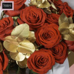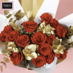 A classic dozen red roses beautifully paired with natural gold-tinted eucalyptus , timeless, romantic and perfect for the festive season.