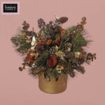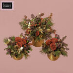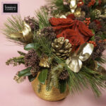 A luxurious pair of arrangements in elegant gold vases, featuring deep red Roses, Skimmia, Ilex berries, lush Nobilis, Pine leaves, Eucalyptus, and golden-accented Pinecones , perfect for adding a festive touch to any space.