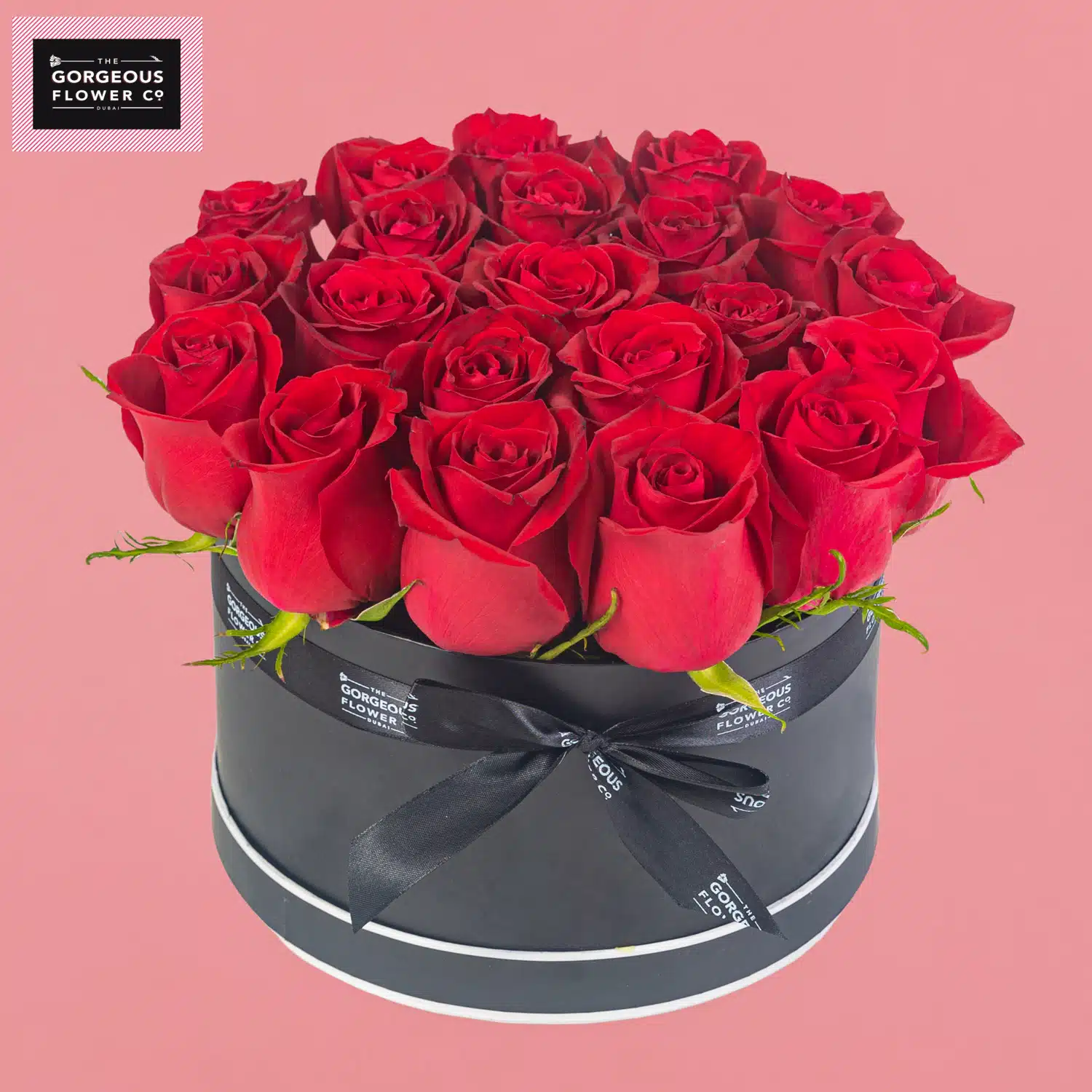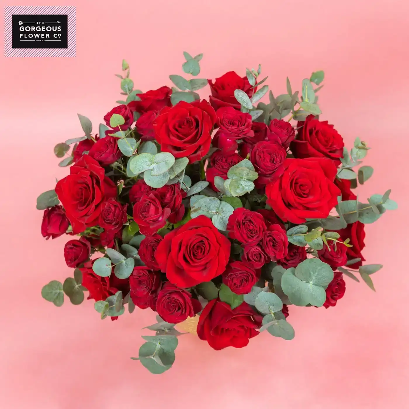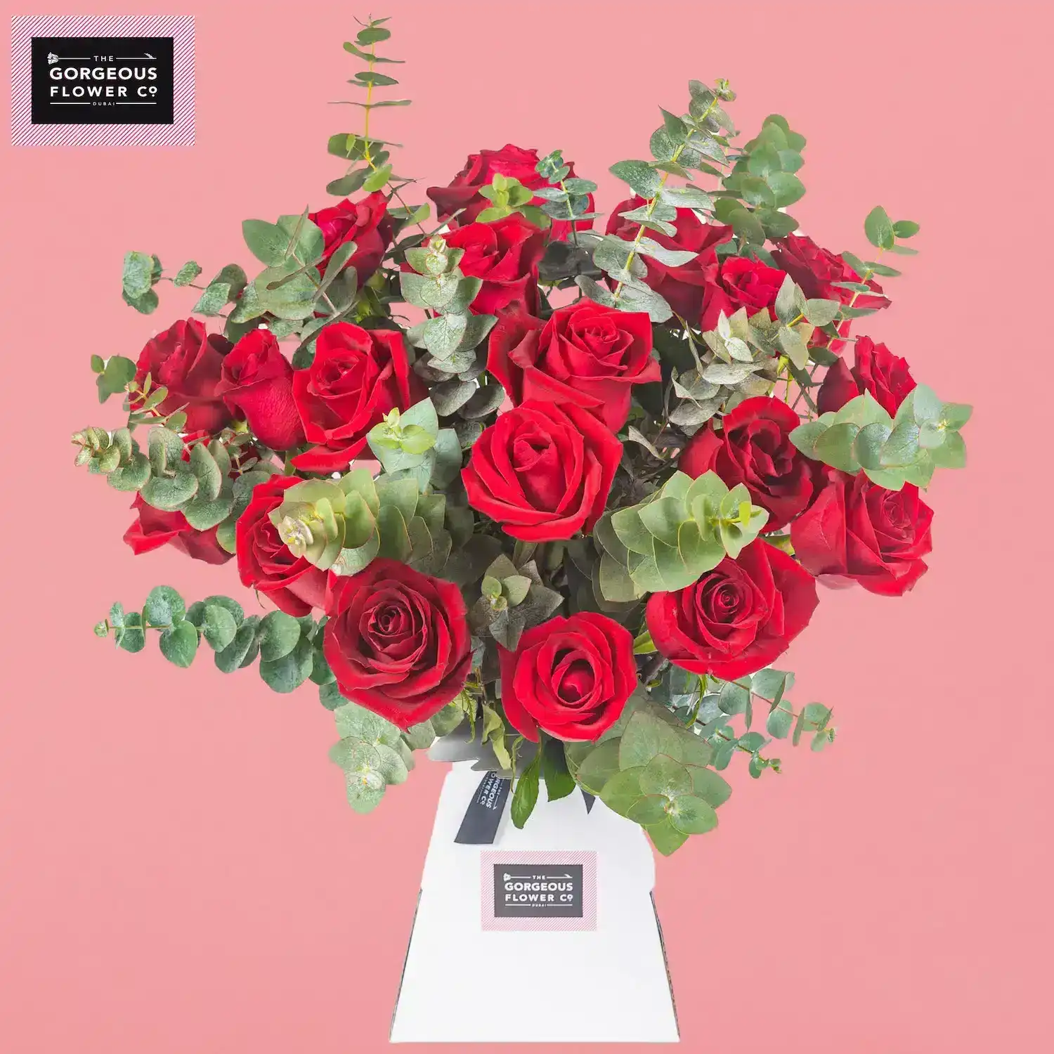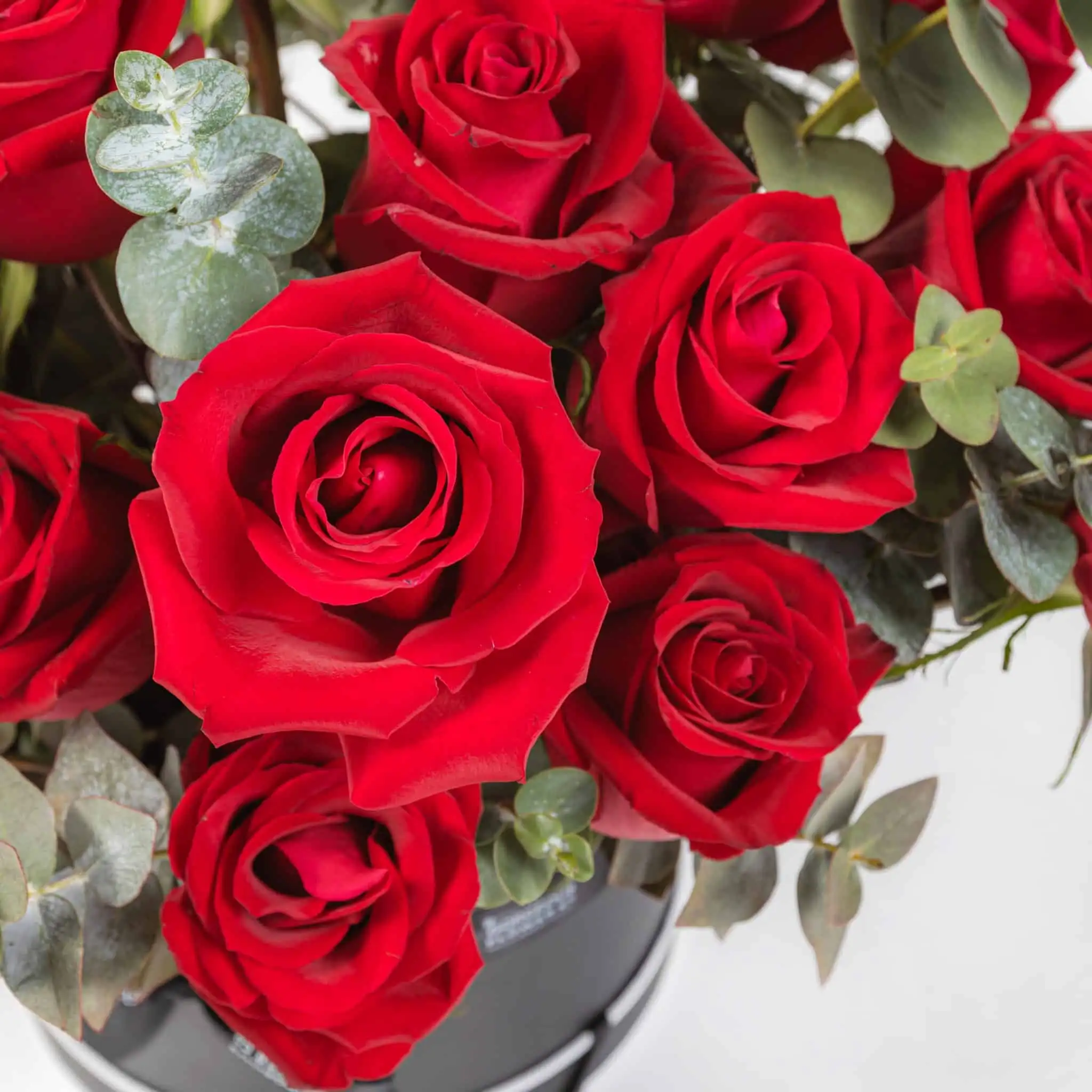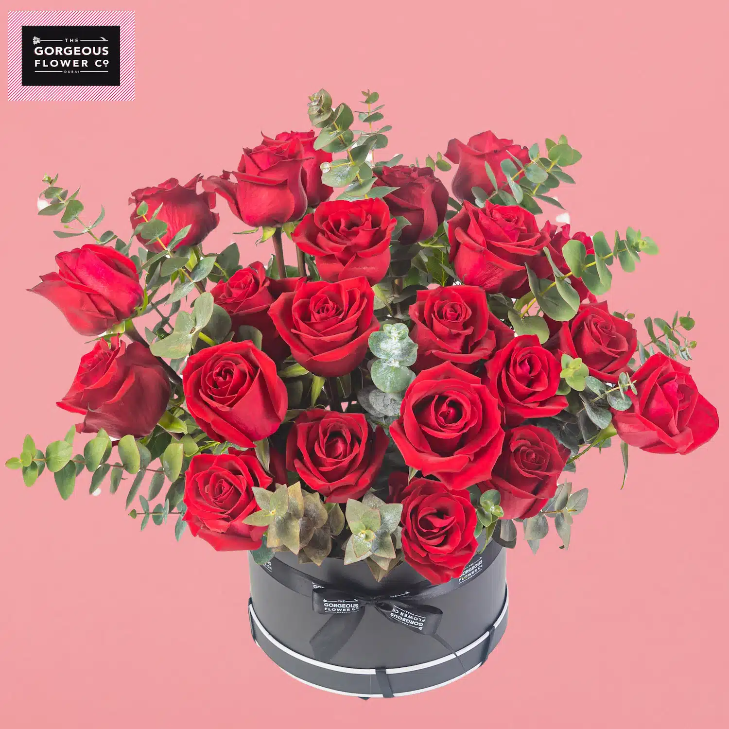 A Gorgeous hat box filled with 25 beautiful Ever Red Roses and Eucalyptus.