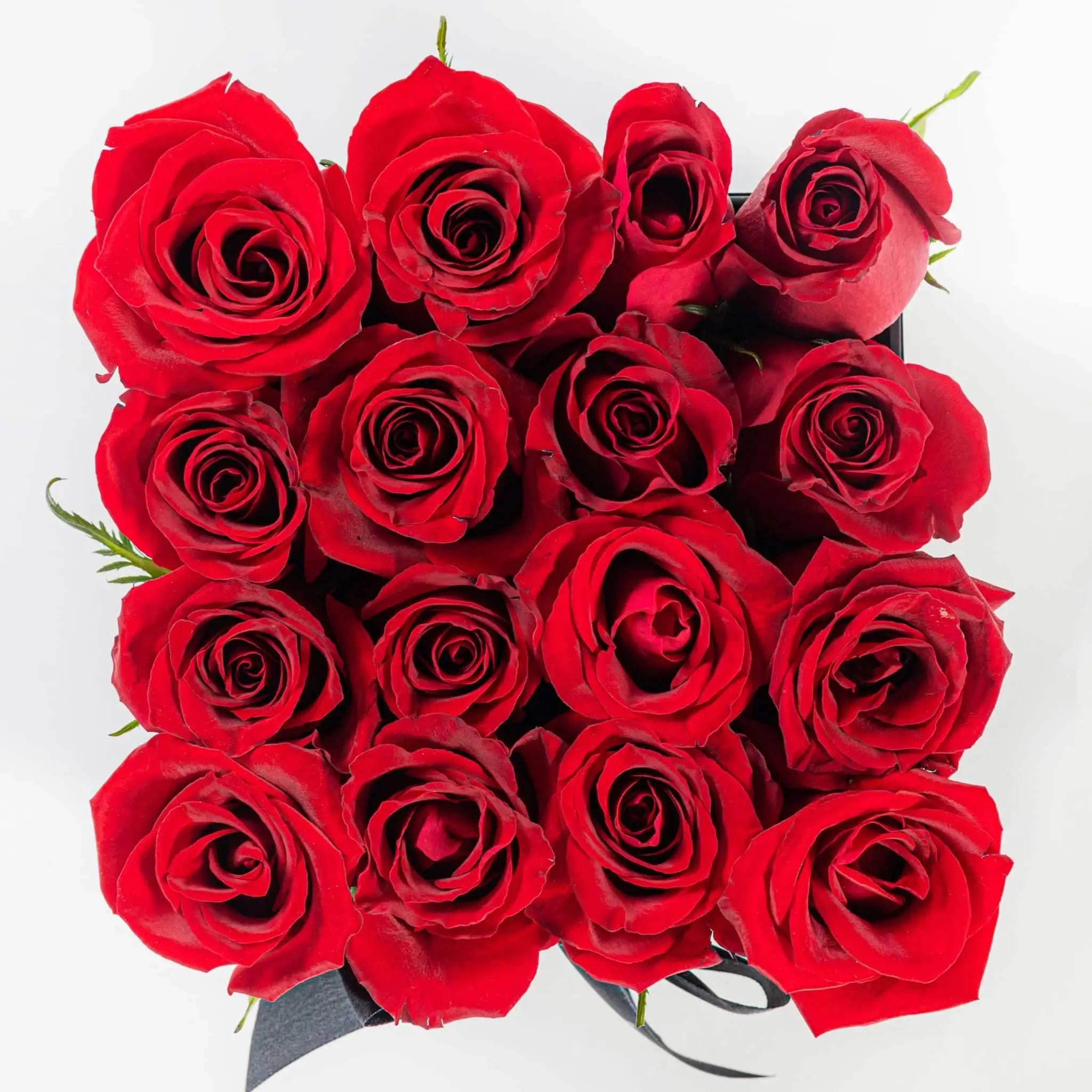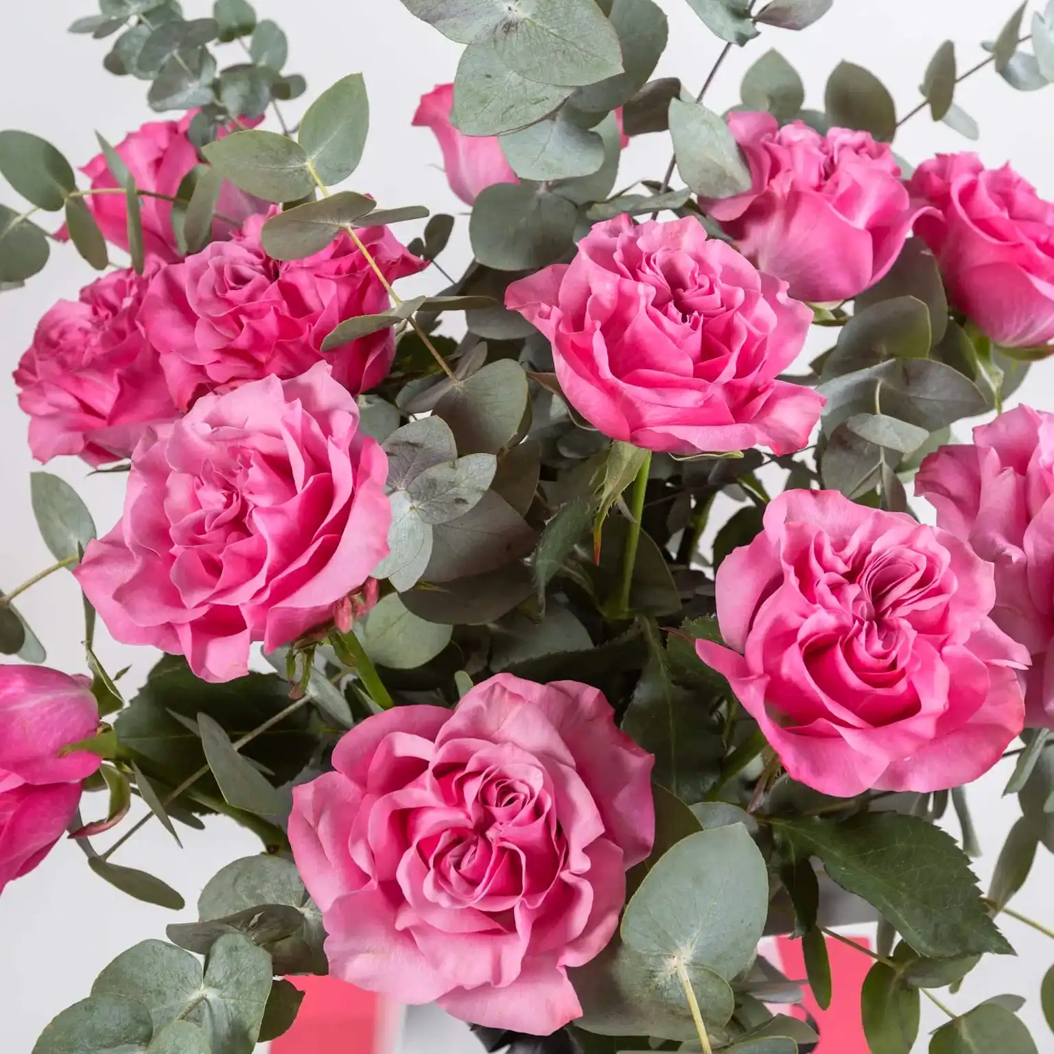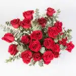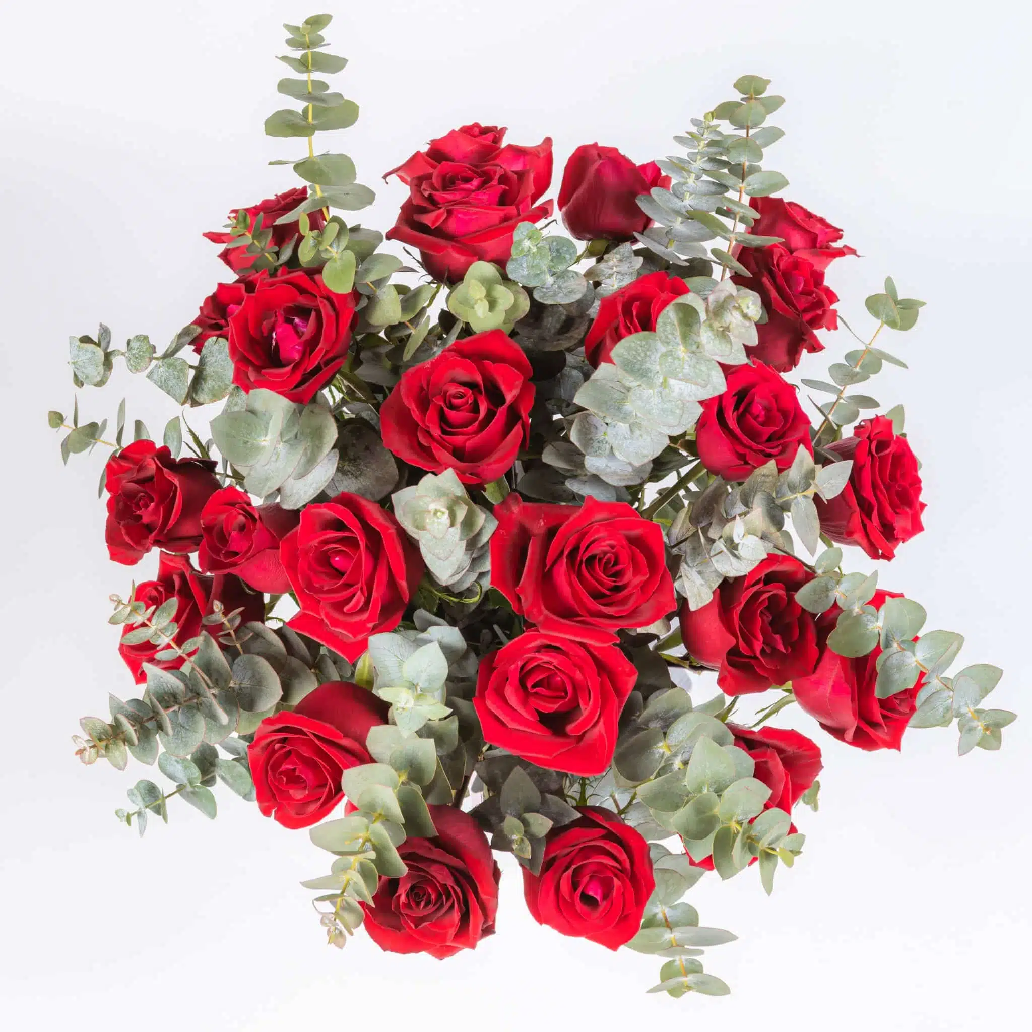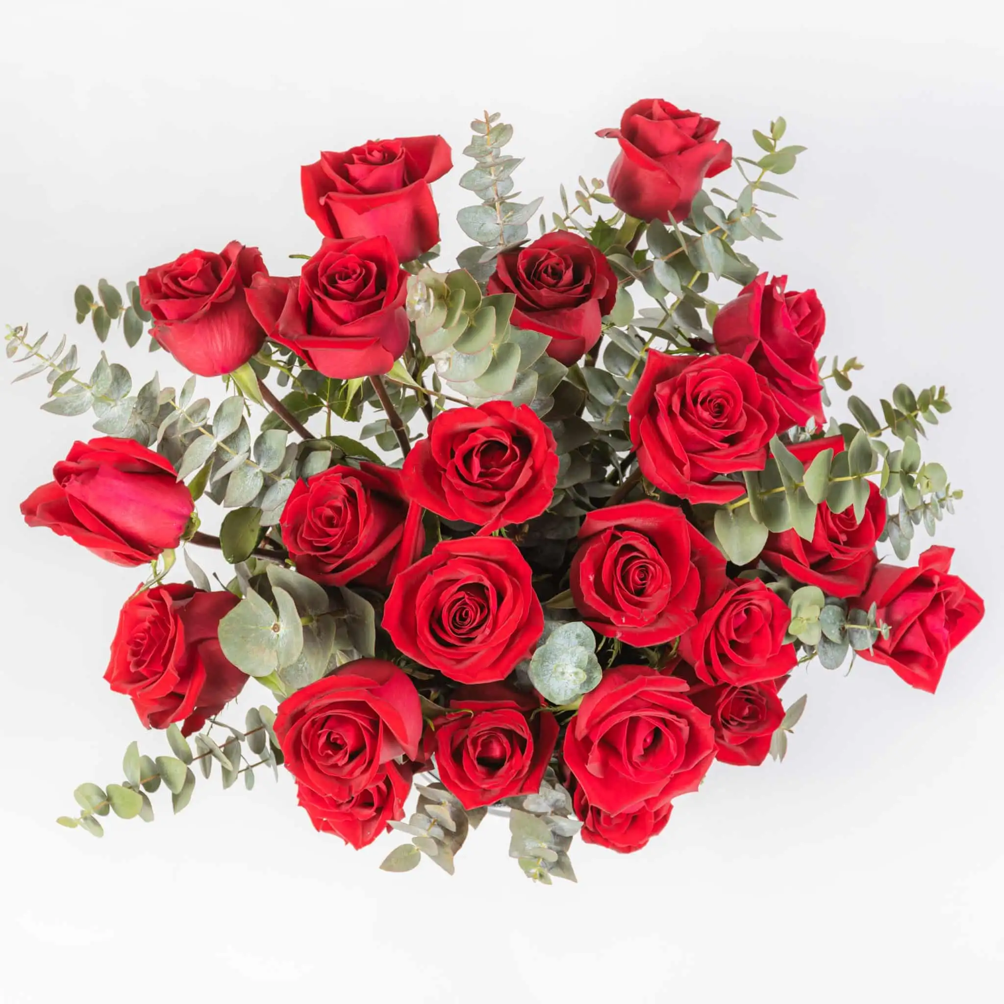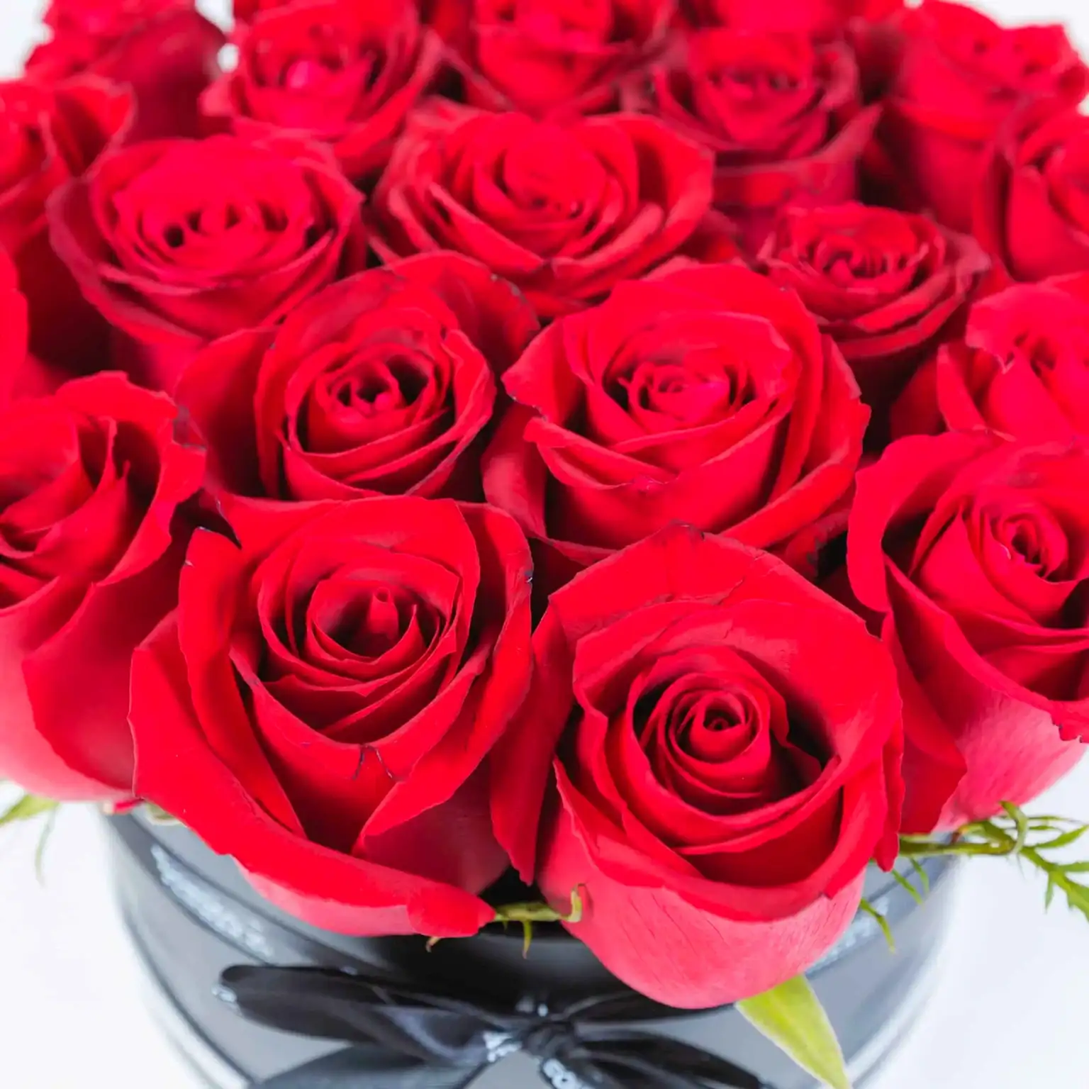 A Gorgeous hat box filled with 25 beautiful Ever Red Roses and Eucalyptus.